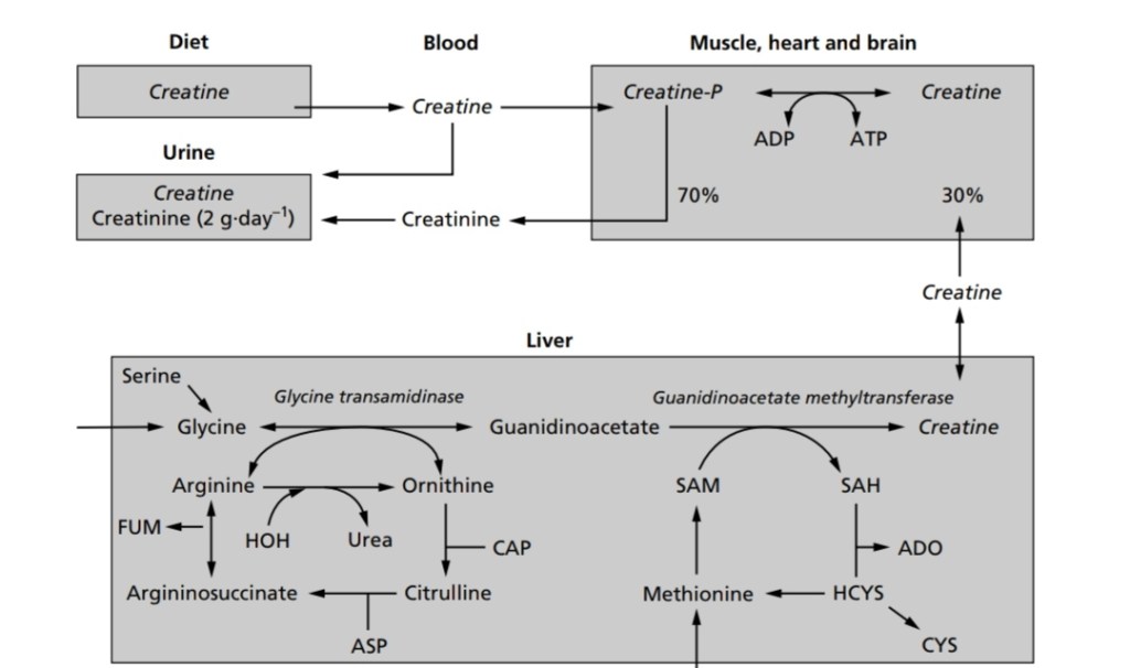 Creatine, or methyl guanidine-acetic acid, is a naturally occurring compound found in abundance in skeletal muscle. It is also found in small quantities in brain, liver, kidney and testes. In a 70 kg man, the total body creatine pool amounts